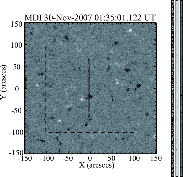 Figure 1: SOHO MDI longitudinal magnetograph taken at 01:35:01 UT on 2007 November 30. The approximate extent of the area scanned by the SP is shown by the rectangular box. We did not get simultaneous magnetgorams with Hinode, and cannot tell the exact position of scan. The larger square shown with dashed lines shows the area used to estimate the total vertical flux. The three images to the right represent the continuum intensity, the net linear polarization LP, and circular polarization of the slot obtained almost simultaneously with the magnetograph. |
