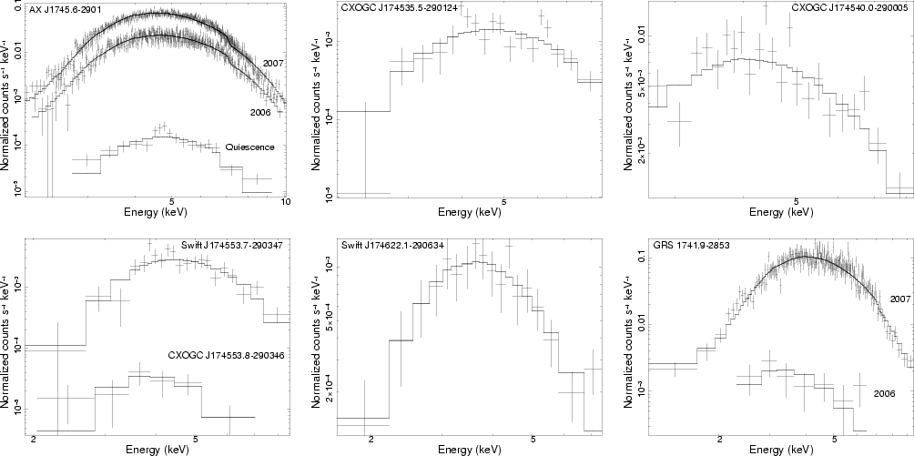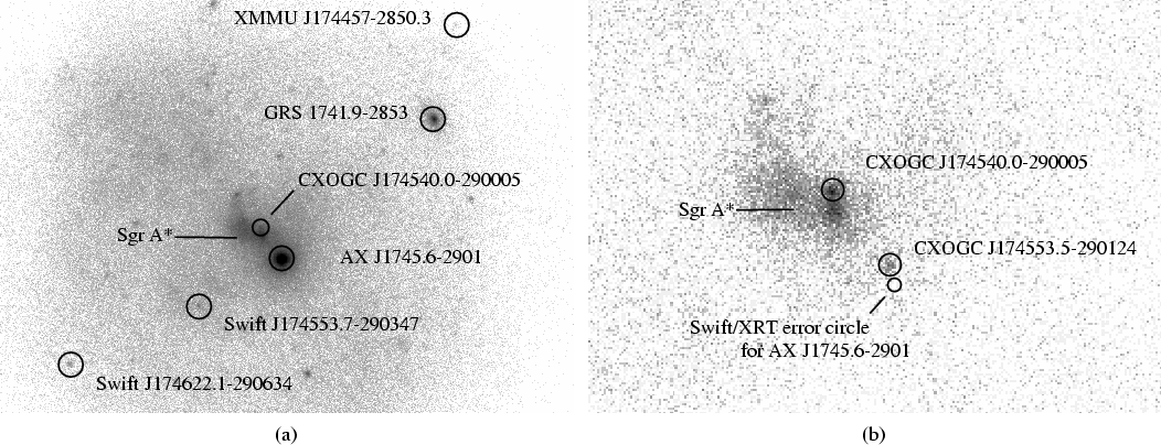 taken from the epoch June 30 till November 2, 2006. This was the only episode during the entire 2006-2007 Swift monitoring campaign in which AX J1745.6-2901 was not active, and a seventh active transient, CXOGC J174535.5-290124, could be detected. CXOGC J174535.5-290124 and AX J1745.6-2901 are so close together, that Swift cannot spatially resolve both sources when the latter, which is the brighter of the two, is active. Apart from CXOGC J174535.5-290124, Fig. 1b also shows CXOGC J174540.0-290005, which lies North of