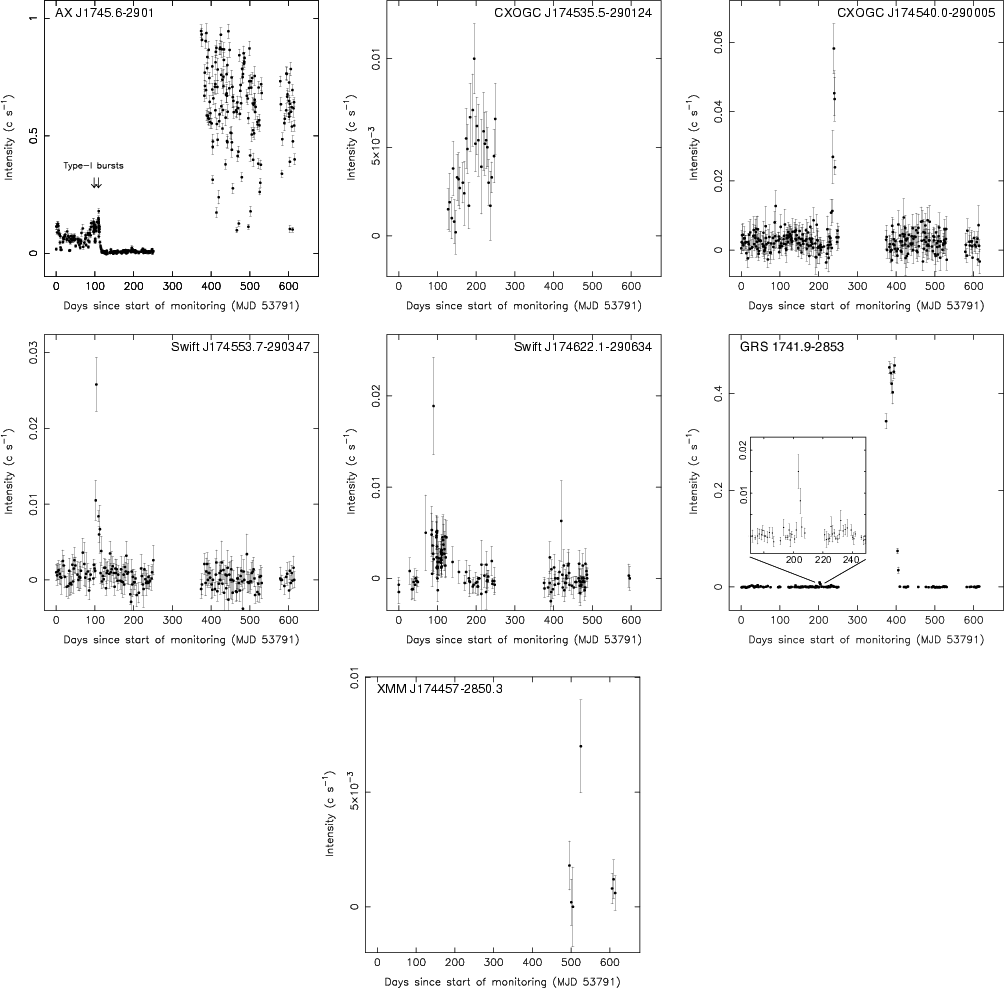 Figure 2: Background-corrected Swift/XRT lightcurves of the seven transients that were found to be active during the Swift monitoring campaign of the GC in 2006 and 2007. During days 252-374 after the start of the survey (February 24, 2006), no observations were carried out due to Solar constraints. In between days 533-579, all Swift's instruments were off-line due to a safe-hold event (Gehrels 2007). Furthermore, Swift J174622.1-290634, GRS 1741.9-2853 and XMM J174457-2850.3 were not always in FOV of the observations, so lightcurves of these three sources contain more data gaps than that of the other transients. We could only deduce information on the activity of CXOGC J174535.5-290124 from Swift observations at times that the nearby, brighter transient AX J1745.6-2901 was not active. This was the case from late June till early November 2006, so the lightcurve of CXOGC J174535.5-290124 only covers this epoch. The plot of GRS 1741.9-2853 includes a zoom in of a small outburst that occurred in 2006. |