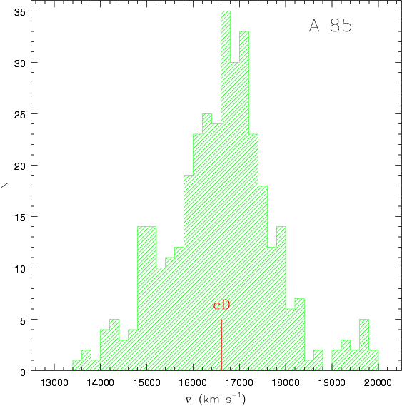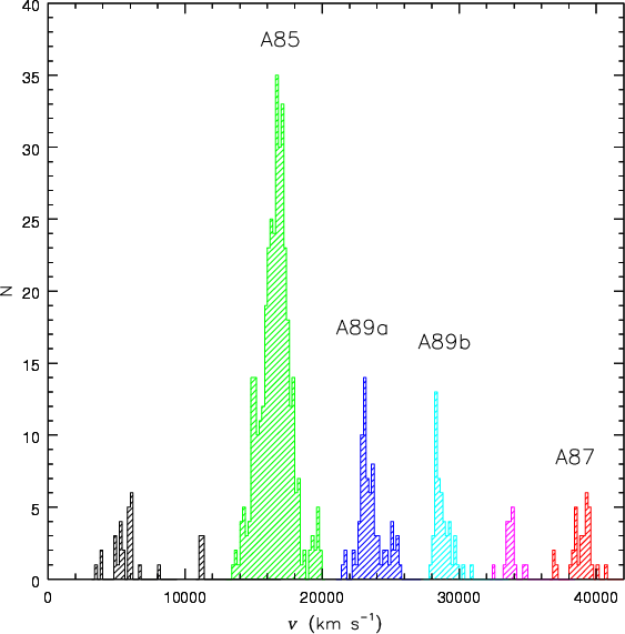 , the largest compilation of velocities for Abell cluster member galaxies to date. For the A 85/87/89 complex (the area inside a radius of 50 arcmin around the center of A 85) this compilation contains 1693 entries, including multiple observations for most of the members. After discarding measurements with large deviations we averaged the radial velocities for each galaxy. This