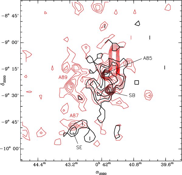 infalling subcluster of A 85 (seen in black contours and labeled SE in Fig. 3), the latter coincident with one of the clumps found by Durret et al. (1998b) in the filament region.