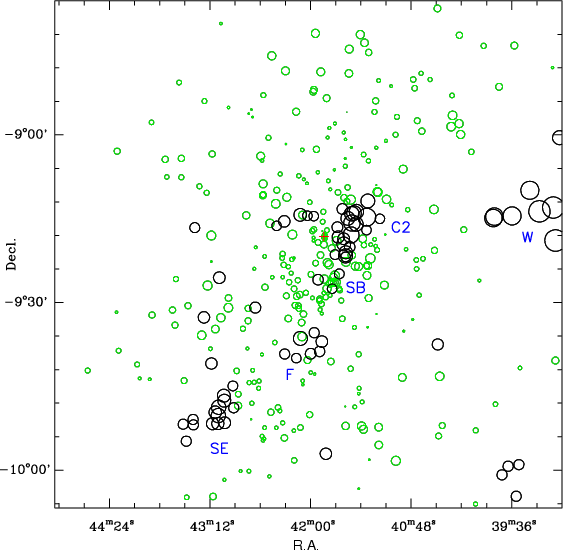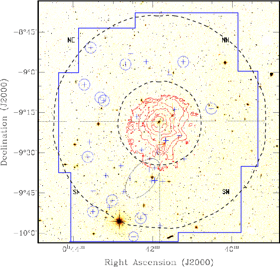 (about 2.1 Mpc) to the south-east of the cluster center (indicated as SE in the figure), which corresponds to the subcluster superposed on A 87