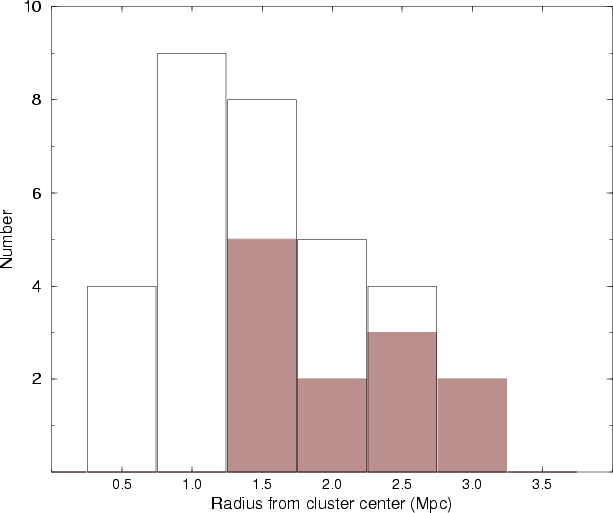 2 Mpc. The observational evidence shown here matches theoretical cluster models such as that of Tonnesen et al. (2007) who predict active gas stripping in that transition zone.