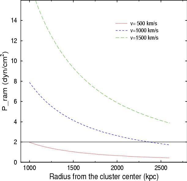 2.5 Mpc. Three different velocities, relative to the ICM, were applied: 500, 1000 and 1500 km s-1. As a comparison, the solid line indicates the value of the restoring force