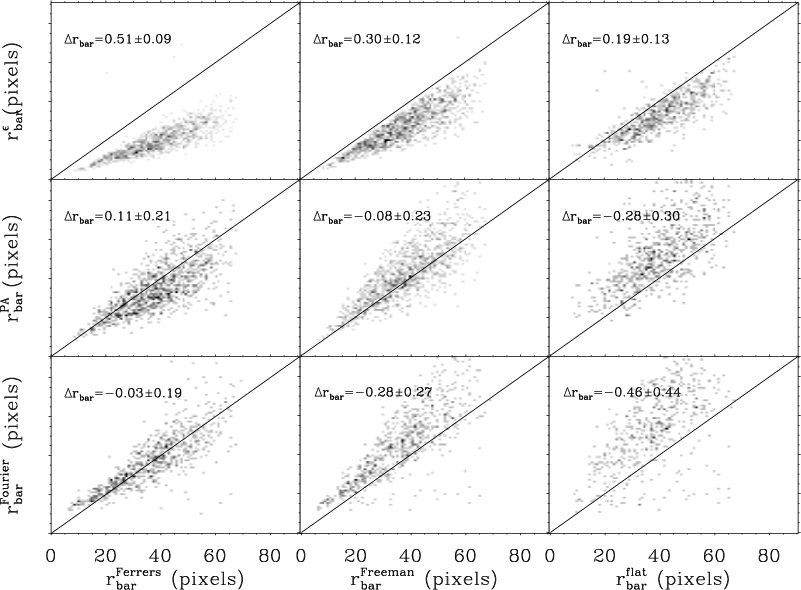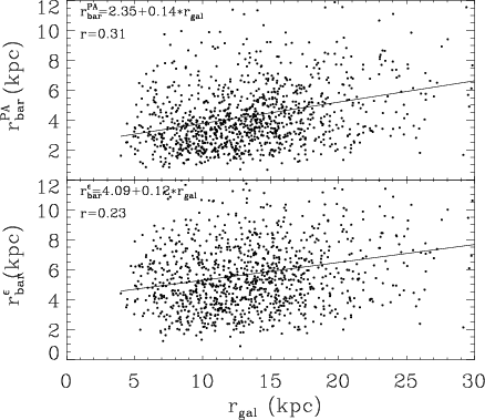 The bar length can be obtained by eye estimates on galaxy images (Kormendy 1979; Martin 1995), locating the maximum ellipticity of the galaxy isophotes (Laine et al. 2002; Wozniak et al. 1995; Marinova & Jogee 2007), looking for variations of the isophotal position angle (Sheth et al. 2003; Erwin 2005) or of the phase angle of the Fourier modes of the galaxy light distribution (Aguerri et al. 2003; Quillen et al. 1994), analysing the bar-interbar contrast (Aguerri et al. 2003,2000a), or by photometric decomposition of the surface brightness distribution (Laurikainen et al. 2005; Prieto et al. 1997; Aguerri et al. 2005). The previous techniques reported that the typical bar length is about 3-4 kpc, and is correlated with the disc scale, suggesting that the two components are affecting each other (Marinova & Jogee 2007; Aguerri et al. 2005; Laurikainen et al. 2007).