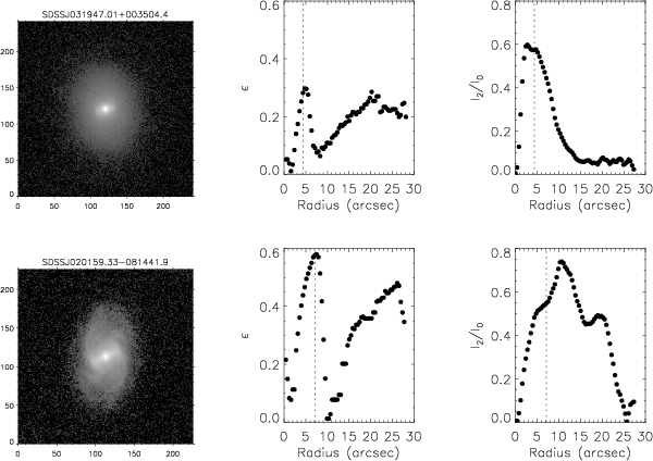 - We have considered that a global maximum in the ellipticity profile is produced by a bar when it is located at more than 3.5 pixels from the galaxy centre. This radial distance correspond to more than 3 times the FWHM/2 of the images.