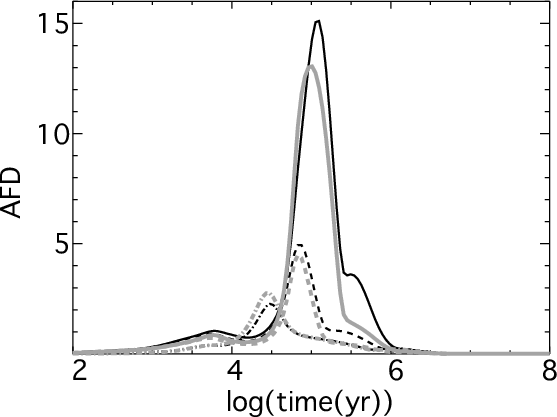 Figure 4: Average fractional difference (AFD, see text) as a function of time. The dashed lines are for case (1), the dashed-dotted lines for case (2), and the solid lines for case (3). Black lines are for case (a) whereas grey curves are for case (b). |