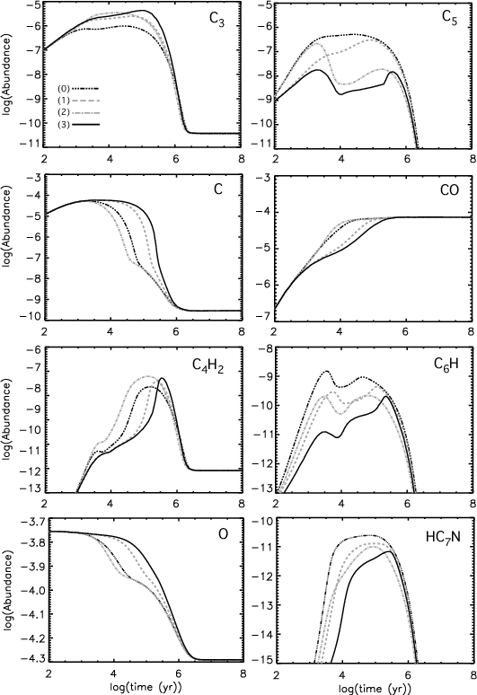 cycle is broken because C5 is not locked in this loop anymore and is destroyed to give C3. The effect of these changes on C-rich molecules such as the ones shown in Fig. 5 is less evident to explain. From a general point of view, larger abundances of atomic oxygen and carbon between 104 and 105 yr destroy these species more efficiently than producing them. The radical C6H for instance is destroyed by C to give C7 and C7 in turn reacts with C to produce C3 and C5 (see Table A.1). Similarly C4H2 is destroyed by the reaction