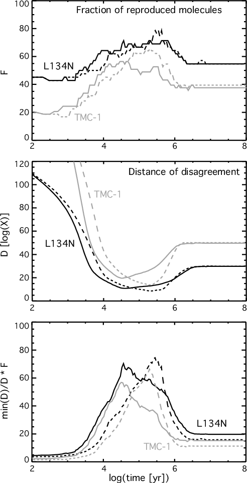 The results of the comparisons are shown in Fig 6 in three panels, for each of which a different criterion is utilized. These criteria are based on the Monte Carlo approach to determination of the uncertainties in the computed abundances based on uncertainties in the rate coefficients, and the overlap of Gaussian distributions representing both the computed and observed abundances (Wakelam et al. 2006a). In the top panel, we use the fraction of reproduced molecules. In the middle panel, we use the so-called ``distance of disagreement'' D in which, for species not reproduced by the first criterion, we sum over the remaining species the distances between logarithms of the observed and model fractional abundances. Finally, in the bottom panel, we use the minimum distance of disagreement (over all times), divide by the distance of disagreement, and multiply by the fraction of reproduced molecules. See Wakelam et al. (2006a) for details on these parameters. The time of best agreement is roughly the same for all three parameters, although the sharpest agreement occurs for the bottom panel. It can be seen in all panels that the general agreement with the observations is slightly better using the new values of the C + Cn rate coefficients. However, the more interesting effect is the shift in time of the best agreement. With the original model, the best agreement was obtained around
