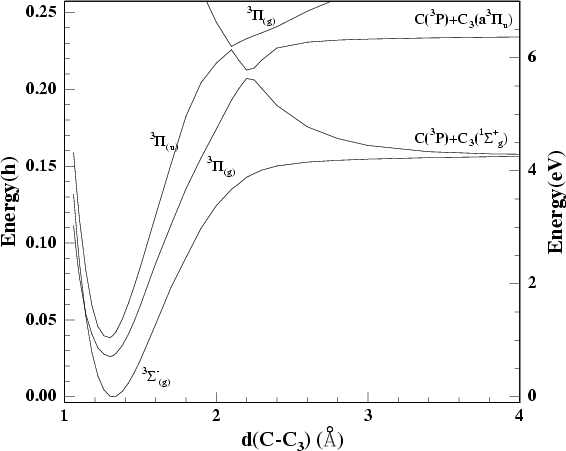 adduct, which is not the ground electronic state of C3 but is highly thermodynamically accessible, lying 5.16 eV below the reactants. Preliminary ab initio calculations (CASCCF, vdz basis, full valence active space) give no barrier for the production of the