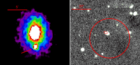 Left panel: the ROSAT-PSPC 0.3-2.4 keV colour coded image of the field of A3571. The X-ray transient is indicated with the arrow. Right panel: GROND image in the |