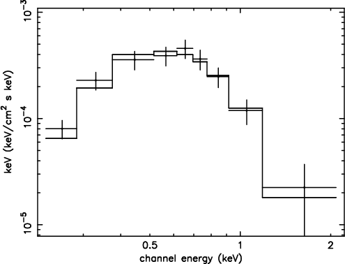 Figure 2: The ROSAT-PSPC unfolded spectrum of the source TDXFJ134730.3-325451 (crosses) and the best fit blackbody model (continuous line). |