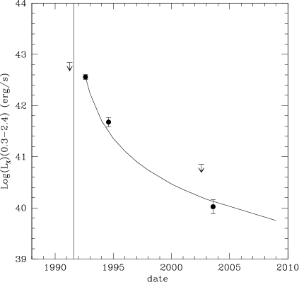 5/3, see e.g. Rees 1990; Evans & Kochanek 1989). Note that according to the lightcurve, the source at the maximum could have been at 1-2 orders of magnitude brighter with respect to the time of the ROSAT-PSPC observation. If the source continues its decay, it would be detectable with Chandra for all the year 2009 and 2010, with moderately deep exposures.