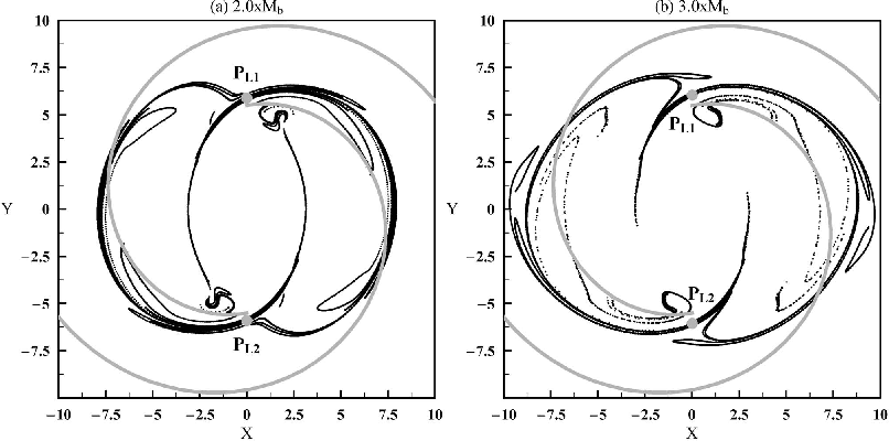Equation (A.4) gives the intersections of the banana-like curves of zero velocity on the axis connecting the center to the stable Lagrangian points. The forbidden regions of the CZV can be compared with the corresponding forbidden regions of the surface of section