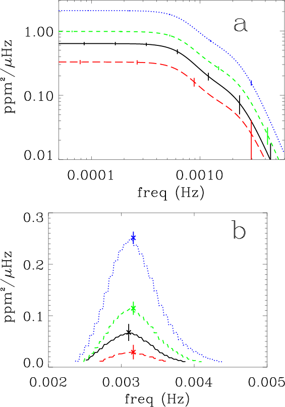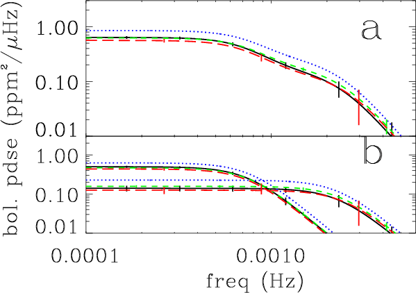 Figure 3: a) Observational instrumental power density spectrum associated with the stellar background contribution and estimated as described in the text, for PMO6 data (plain black line), SPM-blue (dot [blue]), SPM-green (dash [green]), SPM-red (long dash [red]); b) same for the oscillation contribution. |