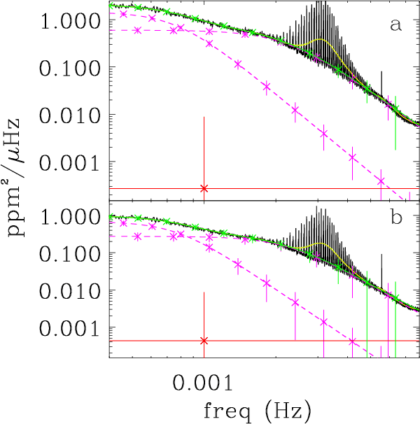Then, we perform a least square fit of each spectrum with three components: a flat white noise contribution essentially due to photon counting noise, the solar background contribution detailed hereafter, and on top, the stellar oscillation spectrum contribution. For the solar background contribution, following Harvey (1985) and