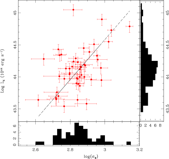 Conclusions. Using our redshifts, we calculate the velocity dispersion for all the clusters in the WINGS-SPE sample. We almost triple the number of member galaxies known in each cluster with respect to previous works. We also investigate the X-ray luminosity vs. velocity dispersion relation for our WINGS-SPE clusters, and find it to be consistent with the form