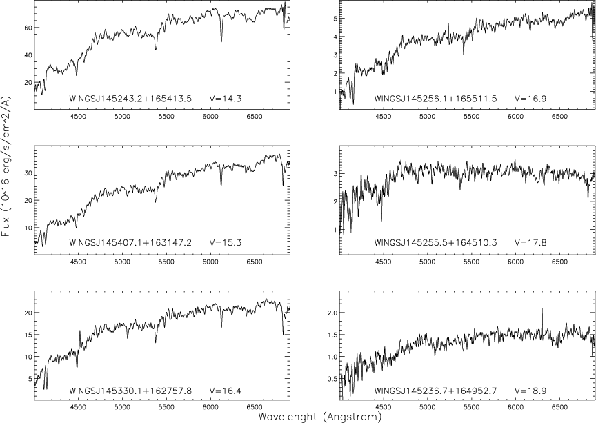 Figure 1: Sample spectra for the northern sample observed with WYFFOS spectrograph at WHT. Spectra of bright ( left) and faint ( right) galaxies are shown for the cluster A1983. The object IDs and V-band magnitudes are given in each panel. |
