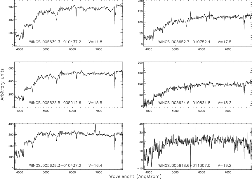 Figure 2: Example of spectra for the southern sample observed with 2dF spectrograph at AAT. Spectra of bright ( left) and faint ( right) galaxies are shown for the cluster A0119. The object IDs and V-band magnitudes are given in each panel. |