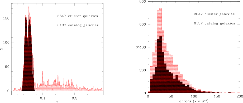 Figure 3: Distribution of redshifts ( left panel) and errors ( right panel) over the complete WINGS sample. Red-shaded histograms show the overall WINGS redshift distribution, the black histograms show only the distribution of galaxy members. |