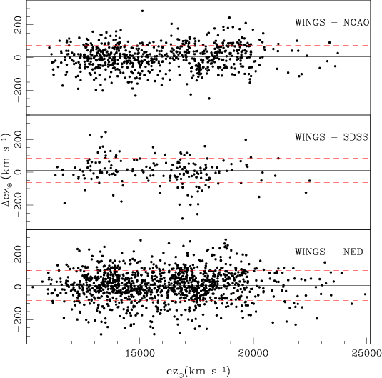 25% of our observing time, mainly during the northern sample observations) prevented us from reaching this goal. For this reason the final WINGS-SPE sample contains 48 (of the 77) clusters, 22 of which are in the southern sky and 26 are in the northern sky. This sample was extracted from the main sample giving the highest observing priority to clusters with few (less than 20) or no redshifts available from the literature. For example, clusters A0085, A0548b, and Abell 3558, which have large databases of available redshifts, had a lower priority.