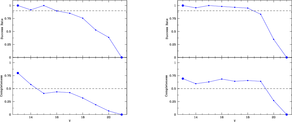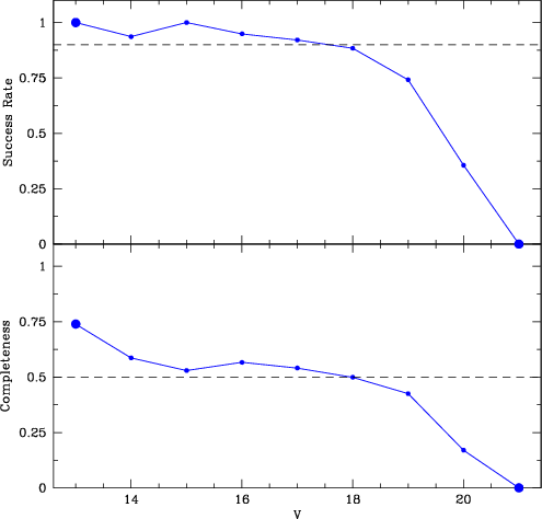20.5<V<21.5 inside the 1.6'' aperture), with total exposure times of 1 h for the bright sample and 2 h for the faint one. He/Argon lamp exposures for wavelength calibration and offset sky exposures for fibre throughput calibration were also obtained. We also observed spectroscopic flux standards, Lick standards, and radial velocity standards during twilight. The reduction of these multi-fiber spectra was performed using the dofiber IRAF package.