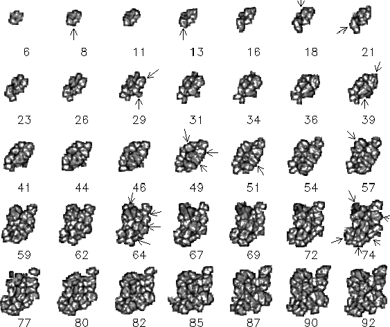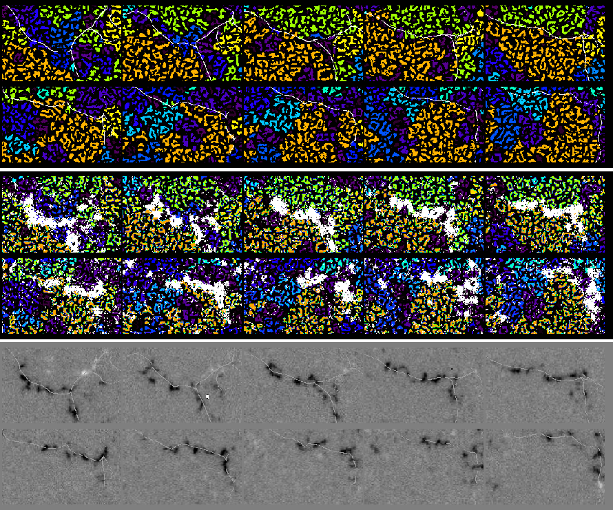3D analysis (x,y,t) of the granular intensity field demonstrates that a significant fraction of the granules in the photosphere are organized in the form of TFGs (Roudier et al. 2003). A TFG consists of a family of repeatedly splitting granules, originating from a single granule. Since our data set is composed of two continuous sequences of 24 h separated by a gap of 7 min, we first analyse separately each of the 24 h series and then connect them together to determine the evolution of TFGs over 48 h.