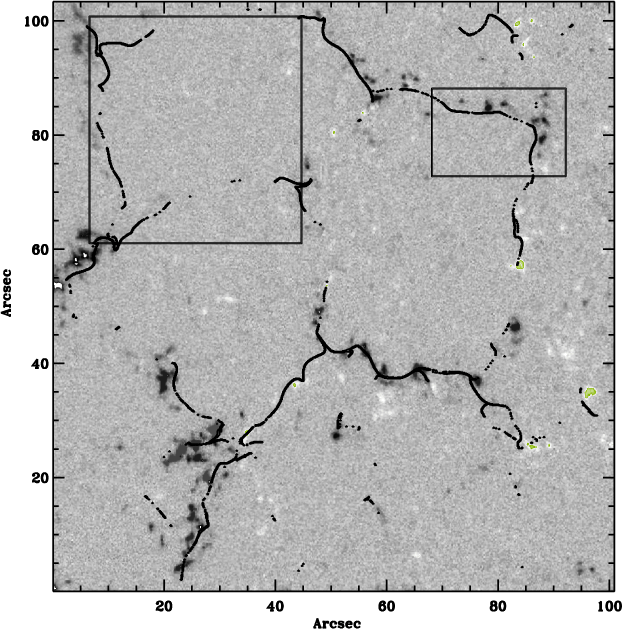 As noted before, this patchy distribution of magnetic fields is closely associated with sites of strong flow convergence. These sites coincide with vertices of supergranular flow cells and presumably correspond to downflows, as required by mass conservation on the supergranular scale (Crouch et al. 2007). The observed stabilization of magnetic patches at supergranular scales possibly indicates that the dynamical Lorentz force feedback provided by these concentrated patches is sufficiently strong to oppose the flow at scales comparable to the supergranular scale, which might explain the emergence of this particular scale in the velocity power spectrum of the quiet Sun.