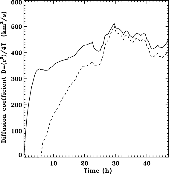 Figure 13: Diffusion coefficient over 48 h (solid line) and the diffusion coefficient computed from 6 h to 48 h with a starting reference position at time 6 h, when the corks are at the mesoscale border (dashed line). |