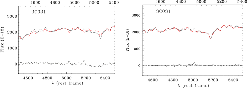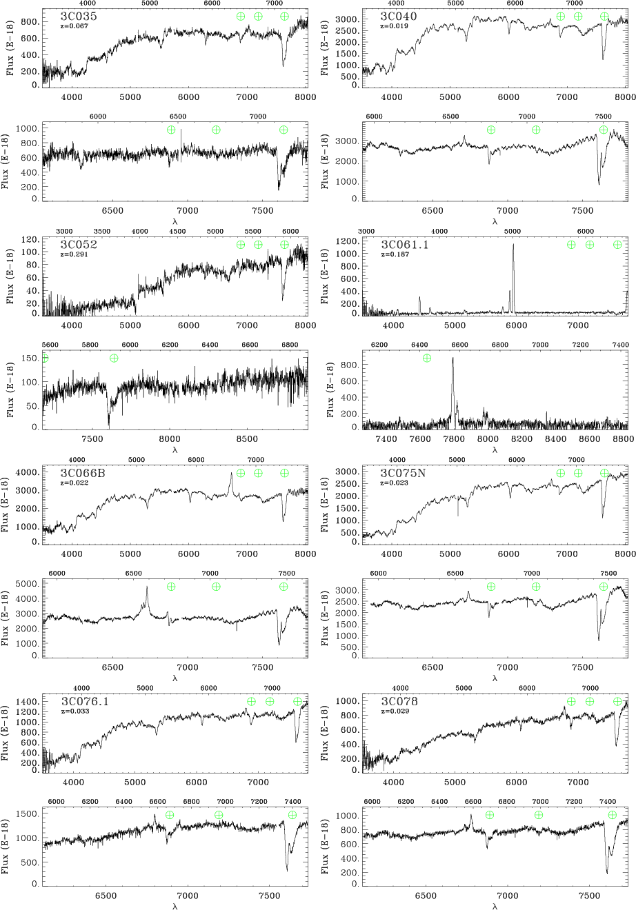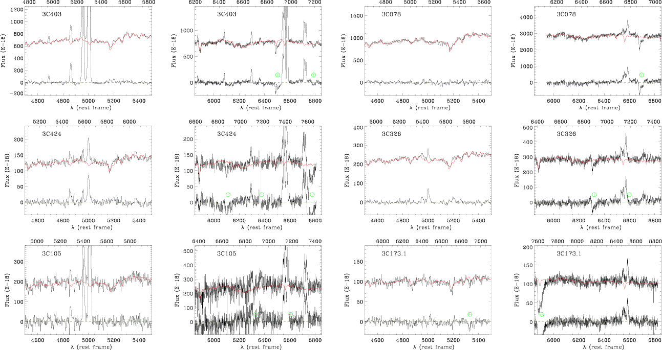 - The redshifts resulting from the spectral fitting always agree within the uncertainties with the published values with the only exception of 3C 130, for which we estimate z=0.032 instead of z=0.109, based on the position of the Na D absorption feature.