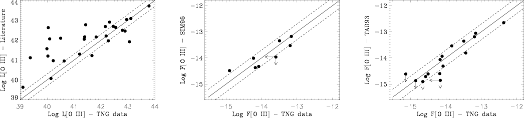 In the central and right panels we compare our [O III] fluxes with the values found by Simpson et al. (1996) and Tadhunter et al. (1993), derived from long-slit spectra of two complete samples, with respectively 8 and 16 sources in common with our 3CR subsample. Their data have been corrected for Galactic absorption before comparison. Quite reassuringly, essentially all sources have [O III] fluxes differing by less than a factor of 2.