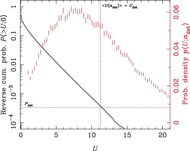 Each of the detection methods discussed in either Paper I or in the present paper can be associated with a statistic U which is to be evaluated at positions of interest: perhaps at the centre of each image pixel, or perhaps at a set of positions of candidate sources. U at any position is evaluated, using a formula particular to the detection method, from the measured counts ci. Clearly U so calculated is a random variable which will occur with some well-defined probability distribution p(U). We can also define an integrated (more strictly, a reverse-cumulative) probability P such that
