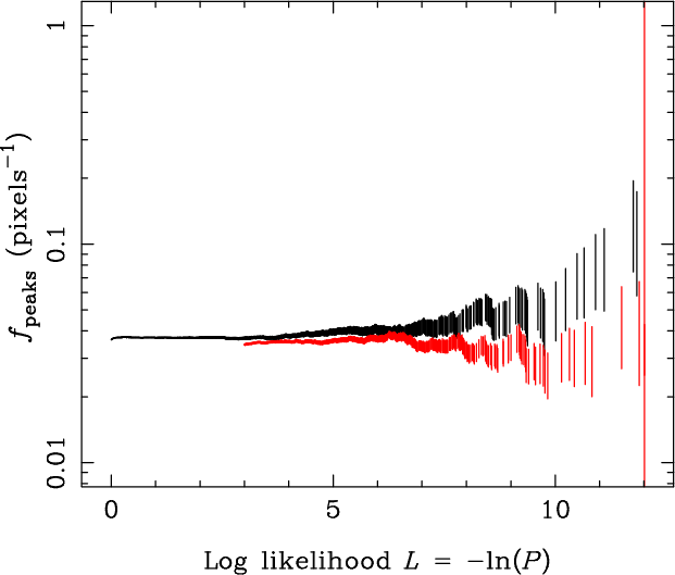 The peak-detection stage does not seem to have been the subject of much study. It is problematical for two reasons. Firstly, the frequency distribution of values at the maxima of a random function (call it the ``peak'' distribution) is not in general the same as the distribution of values over a set of randomly chosen positions (which we might call the ``whole-map'' distribution). In general one would expect the former distribution to be somewhat broader than the latter, since the probability that a random pixel is a peak is small for relatively low values but large for high values. Nakamoto et al. (2000) give a method to calculate the distribution of peaks for a random function of one dimension, but it is not clear if this theory can be extended to more than one dimension. However, as is shown in Sect. 2.4.4, the Cash maximum likelihood statistic does provide a way to estimate the shape of the peak distribution, although not its normalization (which depends on the fraction of map pixels which are peaks). The normalization must be estimated by appropriate simulations.