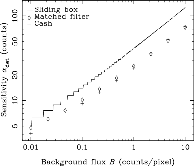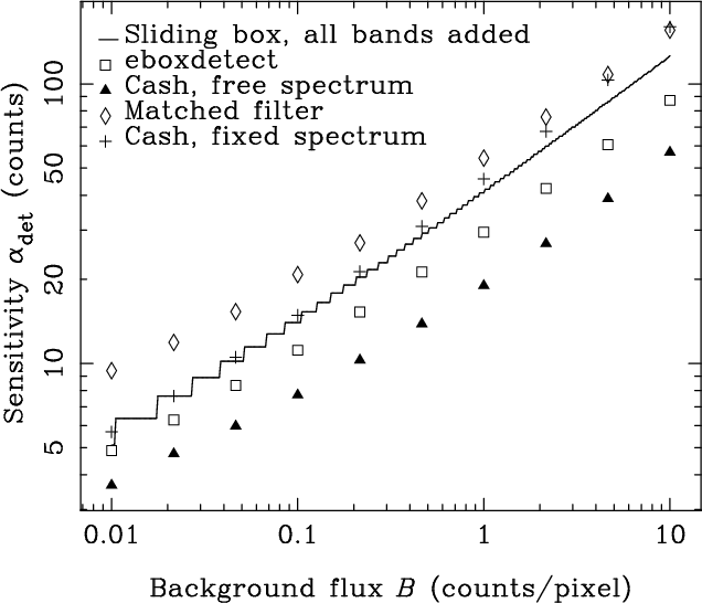 As the sensitivity of detectors and the effective areas of X-ray telescopes have increased, so has the X-ray cosmic background been increasingly resolved into compact sources. E.g. a telescope such as XMM-Newton detects on average 70 serendipitous sources within the field of view of each pointed observation (Watson et al. 2008). A full characterisation of the X-ray background would shed light upon the evolution of the early universe (see Brandt and Hasinger 2005, for a recent review of deep extragalactic X-ray surveys and their relation to cosmology). It is therefore of interest to find the best way to detect compact sources in these images - that is, the detection method which offers the best discrimination between real sources and random fluctuations of the background.