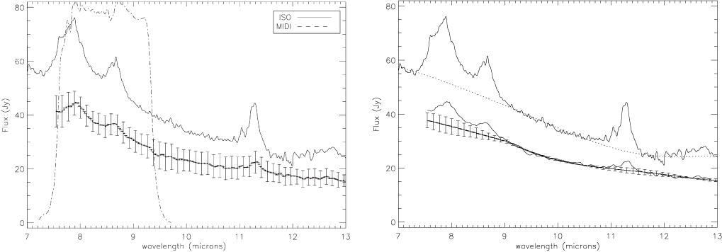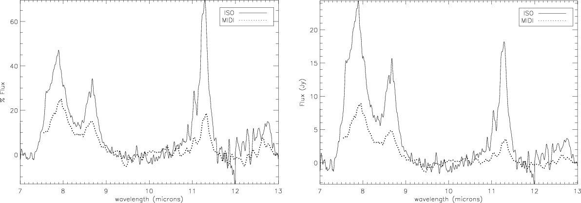 % of the ISO spectrum. An other difference between the two spectra is that the PAH features are weaker in the MIDI spectrum when scaled to the ISO one, the reduction in strength between the ISO and MIDI spectra is much more pronounced for the feature at 11.3