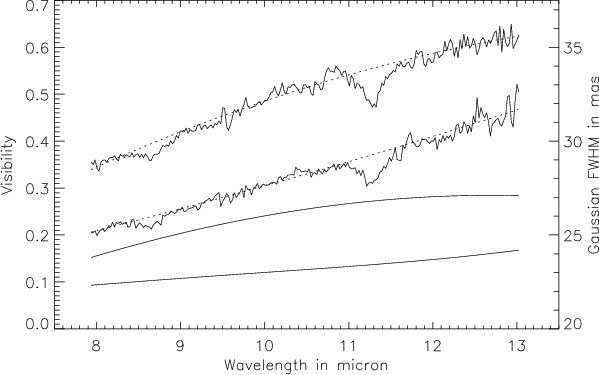 Figure 1: MIDI dispersed visibility of 2004-06-02 ( top, baseline: 40.8 m) and 2004-02-04 ( bottom, baseline: 45.4 m). Using a parabolic fit of these visibilities, a Gaussian FWHM is estimated and shown as the two bottom curves (scale on the right), the 2004-02-04 extension being smaller than the one from the 2004-06-02. |