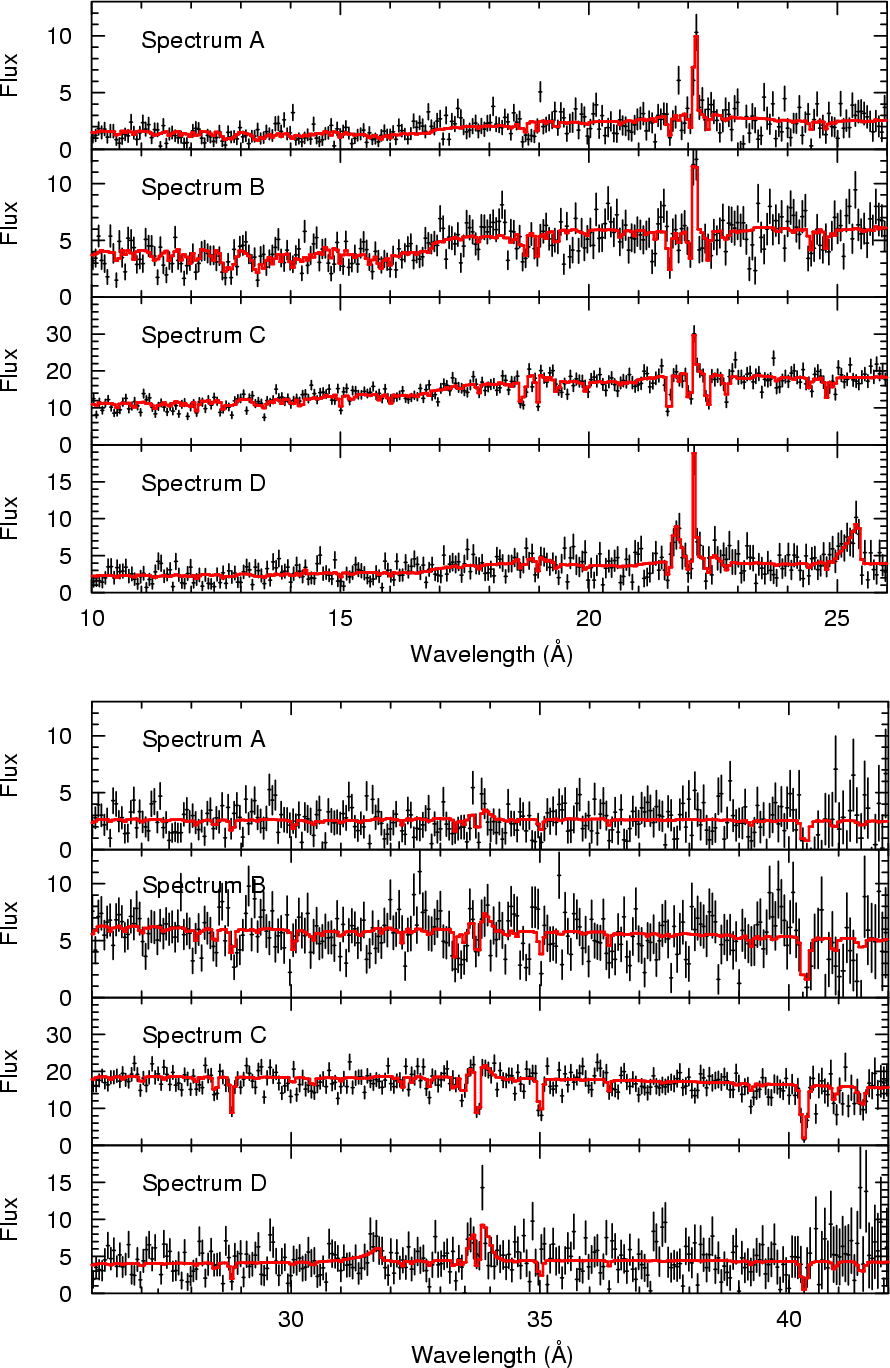 Noting that spectrum C has the highest signal-to-noise of the four spectra, we decided to fit this spectrum first and then use the best fit model as a template for fitting spectrum B. The signal-to-noise ratios for spectra A and D are poor, therefore we only left a limited number of parameters free when fitting these spectra.