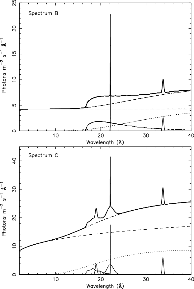 Finally, in spectrum D we afterwards added a spectral component fitting the radiative recombination continua (RRCs). Only the C V and C VI RRCs are present, and can be identified by