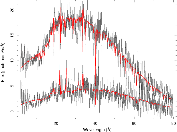 Flux (in units of photons m-2 s-1 Å-1) and our best spectral model. All spectra are binned by a factor of 2 for clarity of display. Note the different continuum levels and shapes between the spectra, especially around the upturn at |