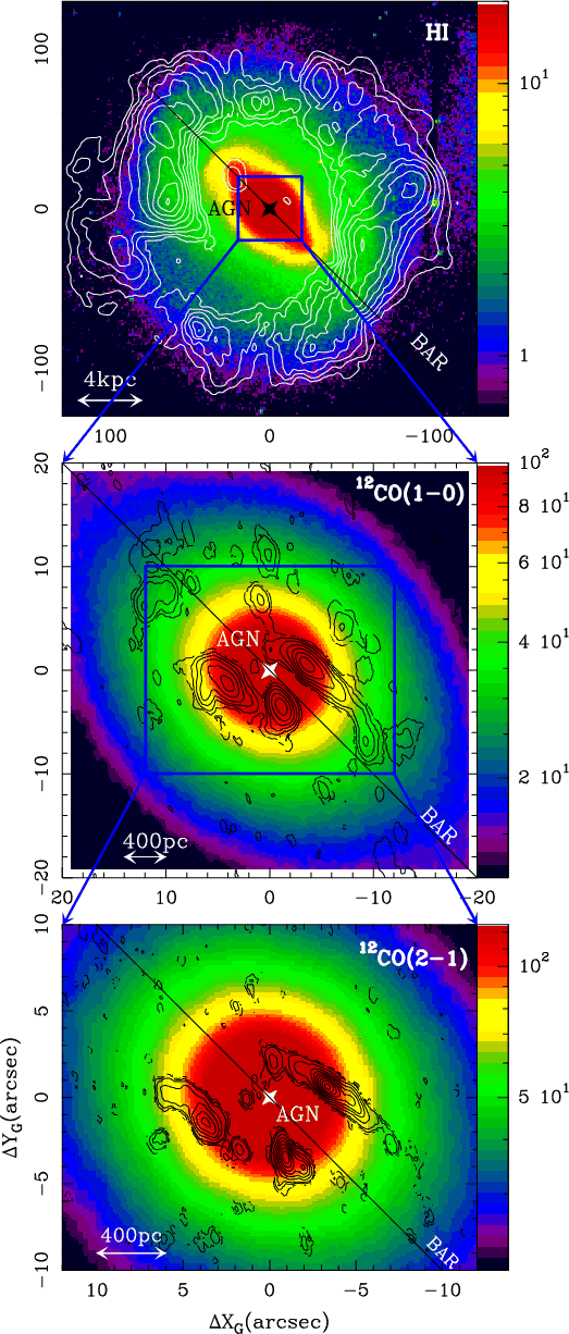 the previous surveys of nearby AGN conducted at the Owens Valley Radio Observatory-OVRO (Baker 2000; Jogee et al. 2001) and at the Nobeyama Radio Observatory-NRO (Kohno et al. 2001). NUGA maps allow us to probe the gas flows at critical spatial scales (<100 pc) where secondary modes embedded in the kpc-scale perturbations are expected to take over in the fueling process. A bottom line result of NUGA is the identification of a wide range of morphologies in the central kpc-disks of these LLAGNs. This includes one-arm spirals or m=1 instabilities (NGC 4826: García-Burillo et al. 2003b; NGC 3718: Krips et al. 2005), symmetric rings (NGC 7217: Combes et al. 2004; NGC 3147: Casasola et al. 2008), as well as gas bars and two-arm spirals (NGC 4569: Boone et al. 2007; NGC 2782: Hunt et al. 2008; NGC 6574: Lindt-Krieg et al. 2008). This result suggests an evolutionary scenario where several mechanisms cooperate to feed the central engines of LLAGNs. More recently, we have completed a parallel H I survey of NUGA galaxies with the Very Large Array (VLA). The aim of this extension of the NUGA project is to use the H I emission as a probe of the distribution and kinematics of neutral gas in the outer disk regions of the galaxies (Haan et al. 2008a,2008b). The overall gas response to the stellar potential throughout the disk is characterized with the help of high-resolution optical and NIR images of the galaxies.