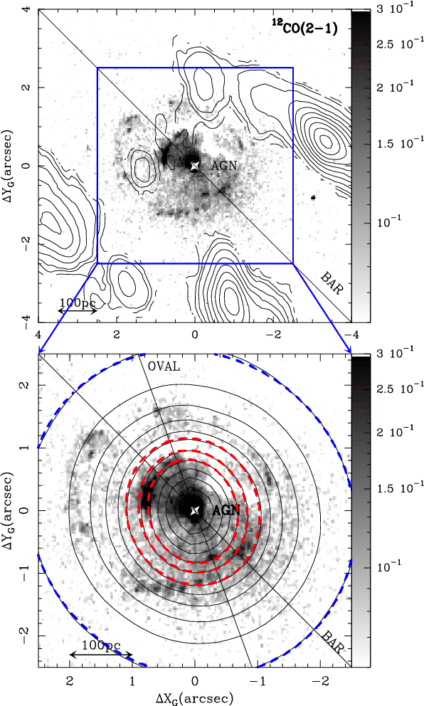 50 pc around the AGN and search for signatures of secular evolution in the accretion process. This is a key to testing the fueling scenario described by GB05. In particular, by studying the different spatial scales of the disk we can assess if dynamical decoupling is at work.