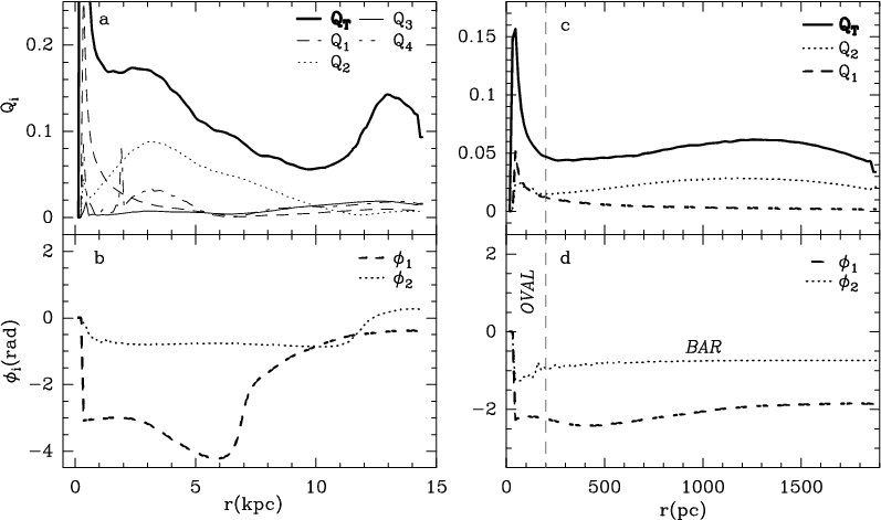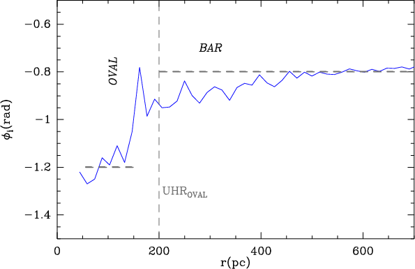 300 pc. Closer to the AGN (r < 200 pc), gas feels negative torques due to the combined action of the large-scale bar and the inner oval. The two m=2 modes act in concert to produce net gas inflow down to r
