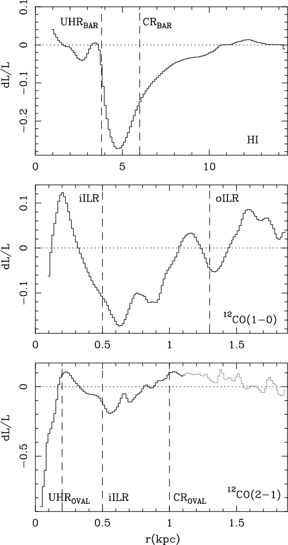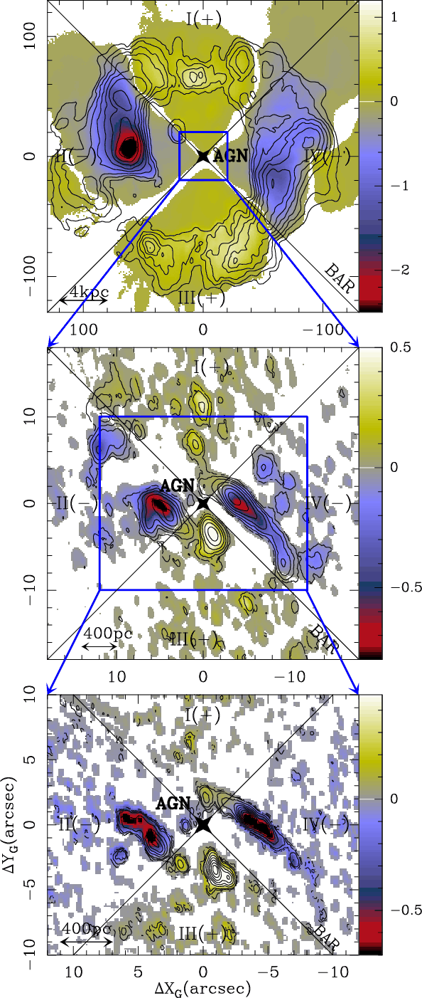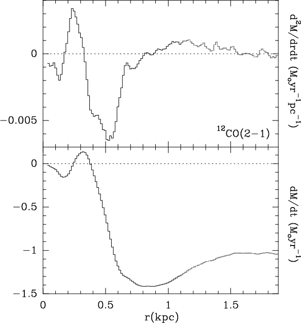1.5 kpc disk. The inferred overall mass inflow budget was seen to be clearly negative down to
