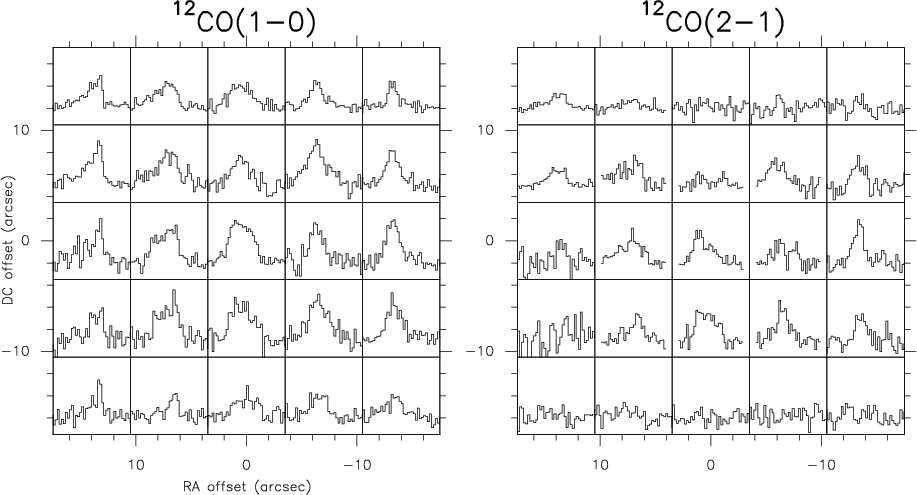 We observed simultaneously the emission of the J = 1-0 and J = 2-1 lines of CO in single fields of sizes 42