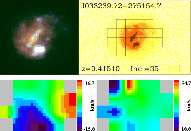 with a starburst, i.e. with ages well below a few 100s of Myr. This is contrasting to many bars in the local universe known to contain relatively old and red stars (Sheth et al. 2003). This paper is organized as follows: in Sect. 2, we present the general morphological and kinetic properties of J033239.72-275154.7, and in Sect. 3, a short description of