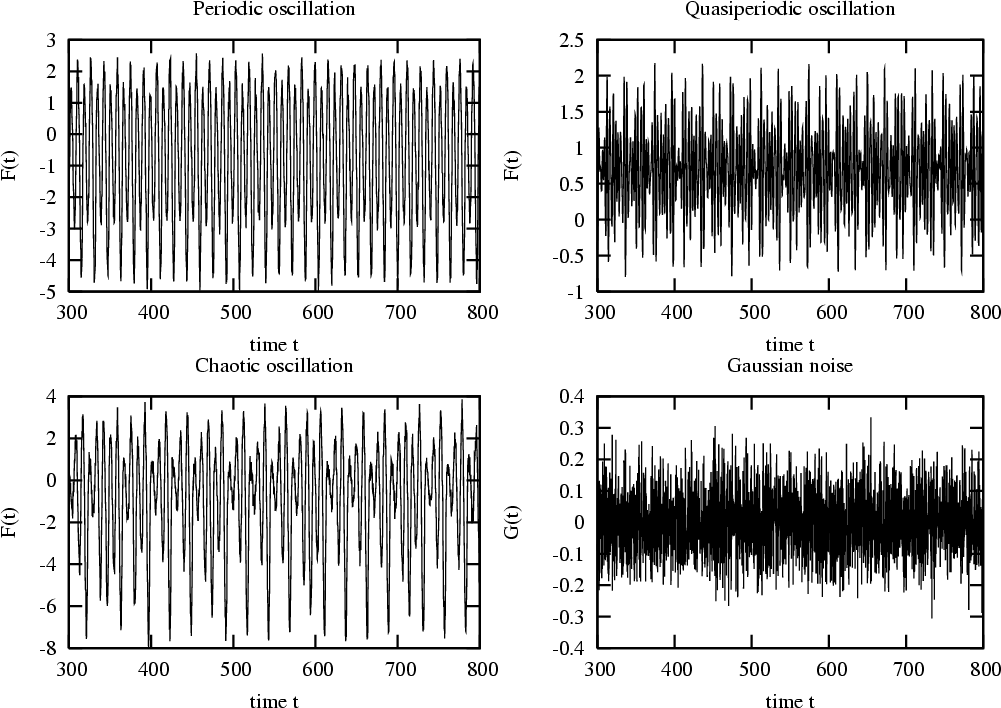 Upper left panel: x(t) solution of the ODE system (1) for the periodic case with a two-limit cycle. Upper right panel: x(t) solution of Eq. (2) for the quasiperiodic case. Lower left panel: x(t) solution of the ODE system (1) for the chaotic case. Lower right panel: Gaussian noise (3) with parameters