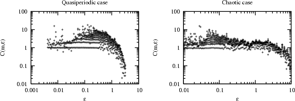 This value agrees with the typical value of the Rössler type attractor. In the case of the quasiperiodic signal we cannot identify the plateau region (right panel Fig. 3). This indicates that there is no self-similar geometry for this type of the signal.