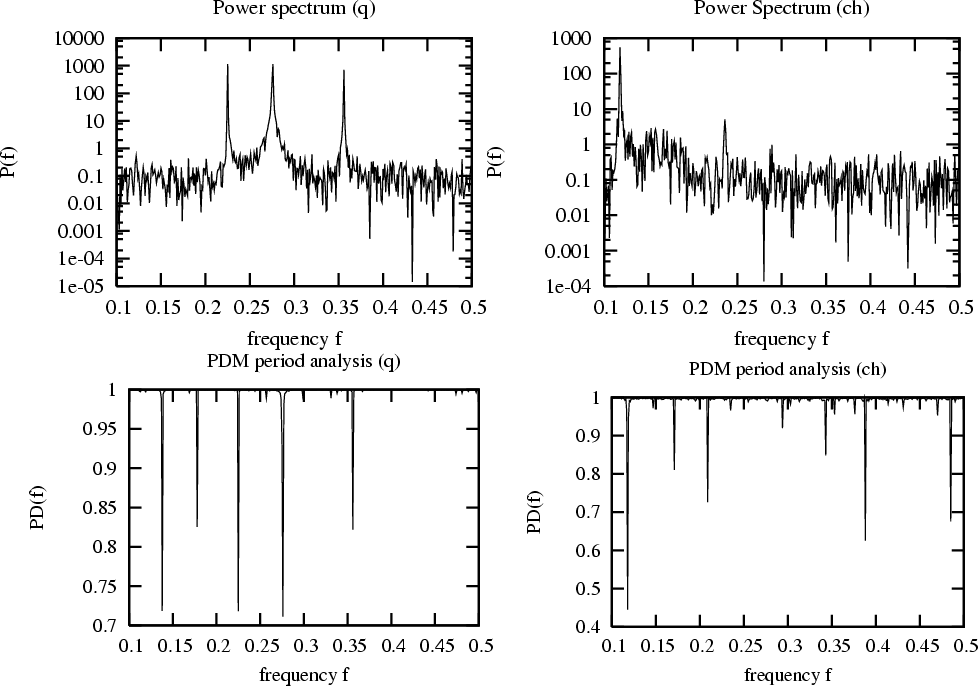 The most common techniques used for period searches are the power spectral analysis (PWS), the modified Lomb periodogram (LPD), the phase dispersion minimalization (PDM), and the string length method (SLM). In the first case, discrete Fourier transformation is applied to a dataset resulting in a power spectrum (for more details see e.g. Scargle 1982). For unevenly sampled series it is better to use a modification of PWS, method LPD (see for more details Lomb 1976). The third method binds data in a grid of phases and minimizes phase dispersion statistics (see for more details Stellingwerf 1978; Lafler& Kinman 1965). The SLM method is similar to the previous one (see Dworetsky 1983), and the LPD method behaves like the PWS. So we limit on the two methods, PWS and PDM only. Obviously, PDM and PWS techniques applied on a periodic signal detect corresponding frequencies without any doubt, but, as we will show, a different situation arises for quasiperiodic and chaotic regimes.