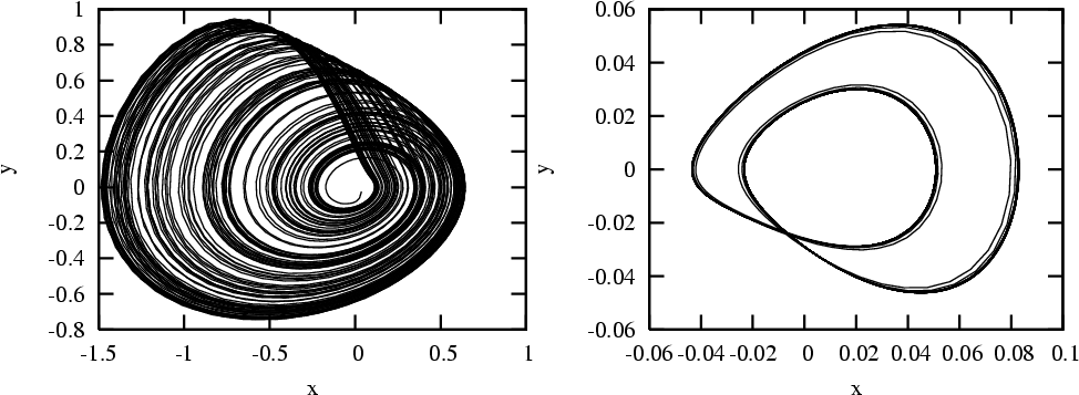 Figure 1: Left panel: chaotic attractor constructed from a numerical solution of the ODE system (1) with the parameters from Table 1. - chaotic case. Right panel: two-limit cycle attractor constructed from numerical solution of (1) with the parameters from Table 1. - periodic case. |