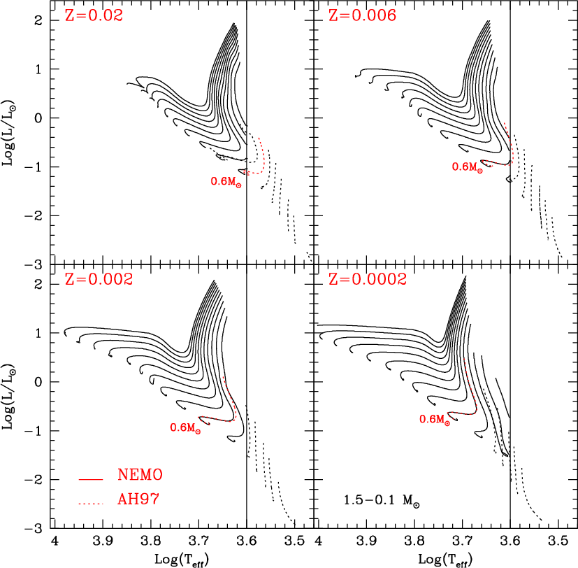 Evolutionary tracks for the labelled metallicities and for masses 0.1, 0.15, 0.2, 0.3, 0.4, 0.5, 0.6, 0.7, 0.8, 0.9, 1.0, 1.1, 1.2, 1.3, 1.4, 1.5 |